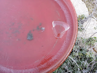 The location of the birdbath was far enough from the roof of the house, or any other structure, where the ice could have fallen from. I was so amazed at this neatly formed thing, that I had to reach out and touch it. Removing my glove, I gently prodded it and found it to be frozen to the surface of the ice below, perched like it had been gingerly placed there.